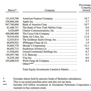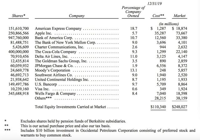 股东信的数据显示,截至2019年12月31日,伯克希尔哈撒韦合计持有市值为2480.27亿美元的股票,购入成本为1103.4亿美元,账面盈利1376.87亿美元。伯克希尔哈撒韦的十大重仓股依次为苹果、美国银行、可口可乐、美国运通、富国银行、美国合众银行、摩根大通、穆迪、达美航空和纽约银行梅隆公司。