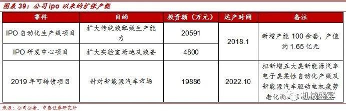 扩产迎接新能源汽车电子产品的需求大年。2019年11月公司完成可转债的发行,融资金额主要用于新能源汽车市场的智能制造生产线扩建项目。项目于2019年10月开始建设,拟新增五大类新能源汽车电子类柔性自动化产线及新能源汽车驱动电机疲劳老化测试系统成套设备,自项目建设起预计三年分期投产。