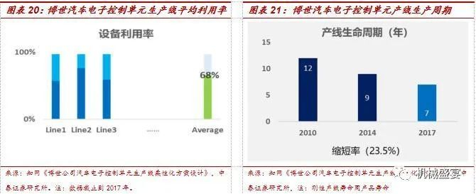 传统产线以刚性为主,闲置率较高,或面临被柔性自动化产线替换的可能。以博世为例,目前其全球190条ECU产线,其中大部分以刚性生产线为主。随着汽车电子种类更新替代加快,设备利用率2017年仅为68%,远低于行业最佳基准85%,产线生命周期由2010年的12年降至2017年的7年。相比刚性产线,柔性产线灵活度高、混线能力强。以博世为例,我们认为全球汽车电子零部件产线或面临柔性化替换空间。