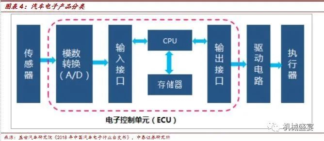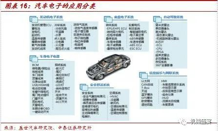 汽车电子主要由半导体器件组成。应用于车辆感知、计算、执行等层面,存在汽车的各个状态中,并实现相应的系统功能。汽车电子种类较多,按应用领域可分为汽车电子控制系统(发动机电子、底盘电子、驾驶辅助系统、车身电子)、车载电子电器(安全舒适、娱乐通讯)等;按用途可分为传感器、控制器、执行器三类。现阶段,汽车工业的创新主要由高效的微处理器、半导体开关和传感器驱动,低成本高可靠性的电子提高了汽车的舒适程度,一些安全系统如安全气囊控制系统离开电子技术根本无法实现。