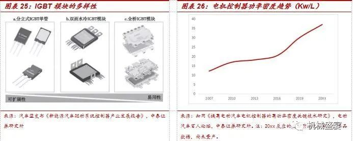 产品的多样性来源于电子电路的多样性以及电子元件的不断发展。当前在新能源汽车控制器中,DCDC电路中的IGBT模块主要分为单管、双面水冷式、全桥IGBT模块,随着功率电子模块的升级、电路结构设计的优化,电机控制器功率密度随之增长,对应汽车电子控制器的体积变小。