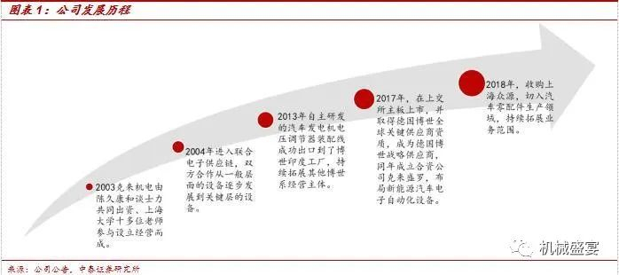 公司持续深耕汽车电子自动化领域。公司成立于2003年,初期以承接一些简单的自动化工程项目为主。2004年进入联合电子(博世集团与中联汽车电子之合资公司,由博世集团控股)供应链,双方合作从一般层面的设备逐步发展到关键层的设备。2013年,公司自主研发的汽车发电机电压调节器装配线成功出口到博世印度工厂,持续拓展其他博世系经营主体。2017年,公司在上交所主板上市,并取得博世全球关键供应商资质,成为博世的战略供应商,同年与上汽集团旗下核心电子零部件企业联创电子合资成立克来盛罗,布局新能源汽车电子自动化设备。2018年,公司收购上海众源,切入汽车零配件生产领域。自成立以来,公司持续深耕自动化设备行业,已经成为国内汽车电子自动化领域领先企业。
