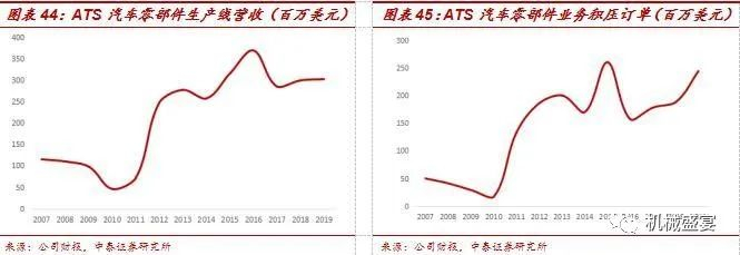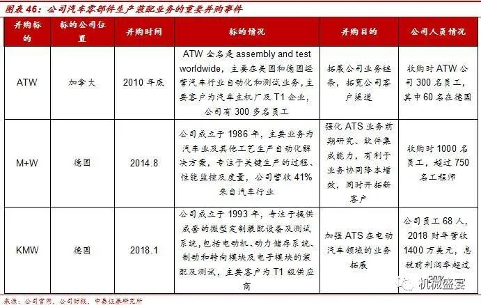 三次并购加强了公司汽车零部件生产装备业务,业绩总体呈现大幅增长。2010年底,ATS收购ATW公司,后者主要在美国和德国经营自动化和测试业务,客户为汽车主机厂及T1供应商。并购后ATS汽车零部件生产线业绩由2008年金融危机后的不到1亿美元迅速增长到2012年的2.45亿美元;2014年8月公司收购M+W公司,后者主要业务包括汽车行业的自动化生产解决方案,公司该板块业绩再次增长至2015年的3.15亿美元;2018年收购主业为微机装配业务的KMW,加强公司在电动汽车领域的布局,在全球汽车产销量下滑的情况下,公司2019年业绩依然实现微弱增长。