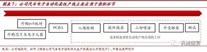 在汽车电子领域,公司主要生产控制器、执行器装配工艺阶段柔性自动化生产线。汽车电子可以分类为:传感器、控制器、执行器,参照招股书、年报及公司官网披露的主要产品,对其进行重分类后,我们认为公司主要生产电子产品装配工艺阶段的柔性自动化生产线。