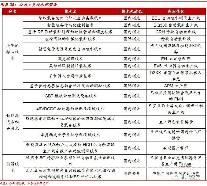 核心技术优势领先,新技术深挖护城河。柔性非标生产线不同于标准件,其生产需要结合客户不同的需求,前期进行研发,这一过程需要懂客户的产品生产,熟练掌握材料力学、机械、电气等多专业,将各类仪器仪表、传感器、控制器、工业机器本体与周边配套设备以合理、高效的方式进行组装、连接。公司深耕于汽车电子自动化设备领域,积极布局新能源汽车各类ECU、IGBT封装设备自动化,目前已实现供货博世及上汽大众MEB项目,其中为大众MEB项目配套的电主轴装配及测试自动化生产线正在产能爬坡阶段。