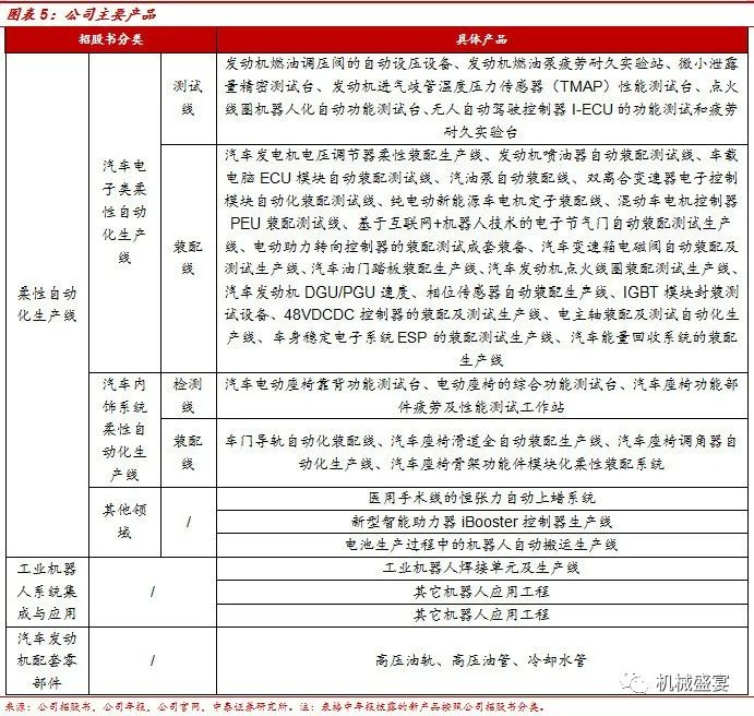 公司主要产品包括:柔性自动化生产线、工业机器人系统和汽车发动机配套零部件。其中,柔性自动化生产线和工业机器人系统应用为公司传统业务,下游主要用于传统燃油车及新能源汽车电子领域、汽车机械领域的零部件装配及测试,产品涵盖装配线、检测线、焊接线、喷涂线、折弯线等各类非标智能装备。此类业务以非标产品为主,具有技术含量高、差异化显著等特点。汽车发动机配套零部件业务为公司收购上海众源外延拓展而来,主要向汽车整车或动力总成公司销售汽车发动机所需燃油共轨系统中的零部件,公司直接将产品销售给主机配套厂商,包括国内及国外主机配套厂商。