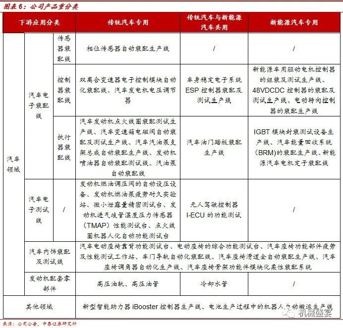 我们将公司主要产品重分类为:汽车领域及其他领域,其中汽车领域包括汽车电子装配线、汽车电子测试线、汽车内饰装配及测试线、发动机配套零部件。根据汽车电子产品分类规则及公司装配线产品的用途,将公司汽车电子装配线细分为:传感器装配线、控制器装配线、执行器装配线。