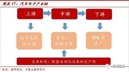汽车电子产业链包括三个层次。汽车电子产业链可分为三个层次:上游为电子元件供应商,相关企业包括IC设计厂商及分立元器件厂商,如恩智浦、英飞凌等;中游为系统/一级供应商,主要进行汽车电子模块化功能设计、生产及销售,相关企业包括博世、大陆、德尔福等;下游为OEM/整车厂。此外,系统/一级供应商之间是二级和三级供应商,一般为中小型公司,对产业链的控制度较低,技术含量低。克来机电主要为中游系统集成商提供配套自动化设备和产线。