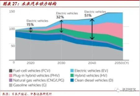 新能源汽车占比提升是趋势。欧洲碳排放政策实施在即引致传统汽车电动化转型、特斯拉全球扩产、中国新能源汽车持续推进,我们认为未来新能源汽车(这里仅包括EV、HEV、PHEV)占比提升是趋势。参考日本电装转载的日本产经省对未来汽车动力结构的预测,2023年全球新能源汽车占比有望达到32%。