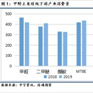 国内2019年累计甲醇产量约6200万吨,相比2018年的4224万吨同比上涨46.8%。从地区来看,甲醇的产区主要集中在西北地区,年产量4000万吨以上。其余地区年产量均不超过1000万吨。甲醇的下游需求行业可以分为传统下游和新兴下游。传统下游包括包括甲醛、二甲醚、醋酸、MTBE(甲基叔丁基醚)和DMF(二甲基甲酰胺)。新兴下游是近十年兴起的甲醇下游行业,包括甲醇制烯烃、甲醇燃料以及少部分的甲醇制氢气。甲醛是主要的传统下游行业之一。甲醛下游约44%-50%为胶黏剂,用于板材生产,此外还包括多元醇、甲缩醛、减水剂等。板材多用于建筑行业,因此近年来由于房地产行业限购,又由于板材工厂多为私营企业存在较多环保和生产问题,受到环保和安全政策影响,板材需求占比逐年减小,甲醛行业的开工率长期处于低位。