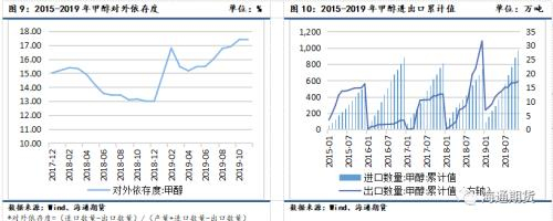 我国甲醇进口量一般占总体消费量的20%以下,进口依存度在去年有走高迹象。我国甲醇进出口一直存在较大逆差,2019年累计进口量达到1087.6万吨,首次突破千万吨,比2018年同期增长46.68%;累计出口仅为17.1万吨,同比下降45.95%。