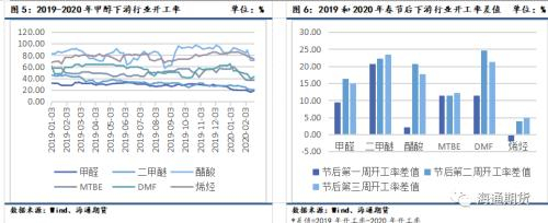 下游大部分需求企业在春节期间停工、放假,各行业开工率均有不同程度的降低。今年春节受疫情影响,下游企业复工时间推迟,使得当前甲醇下游需求不振。其中传统下游如甲醛、二甲醚等行业春节期间停工较多,且受疫情影响较大,甲醇制烯烃行业受春节停工影响较小。