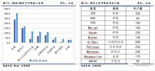 由于伊朗消费有限,以出口为主,叠加地缘政治因素,中国是其主要出口国。因此,伊朗装置产能对我国进口量有一定影响,进而影响我国甲醇价格。2018-2019年伊朗有Marjan、Kaveh、Busher三套新装置投产。产能分别为165万吨/年、230万吨/年和165万吨/年,几乎使伊朗产能翻倍。2019年我国甲醇从伊朗进口量有显著提升,对我国甲醇市场价格产生冲击。