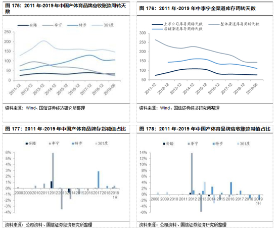 存货周转改善,维持健康水平。中国体育用品市场曾出现严重的库存危机,发生的契机来自于 08 奥运会后的过度扩张、粗放的批发模式以及 2012 年的电商冲击,目前走出危机的品牌均围绕直面消费者的零售战略进行了运营的改革,包括多层分销模式的扁平化、终端门店 ERP 系统的全覆盖、大数据分析下的合理订货和供应链的快反,立足于缩短消费需求的变化到终端产品销售的信息不对称与时间差,并及时捕捉新的消费机会推动增长。在批发模式下品牌的库存无法较为直接的体现全渠道的库存情况,我们选取了应收账款周转、李宁的全渠道库存周转、品牌商的存货减值和应收账款减值来观察国产体育品牌的终端销售情况,可以大致看到:1)安踏的渠道经营情况从 2014 年开始步入正轨;2)李宁的全渠道库存在 2018 年进入相当健康的水平;3)特步 2018 年底开始账期周转改善;4)361 度目前仍维持较长的应收账期。