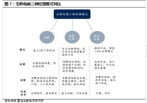1) 综合电商模式:此类模式是综合电商平台开设生鲜频道的体现,通过自营或者第三方商家入驻的方式销售生鲜产品。其最突出的优势在于天然享有流量优