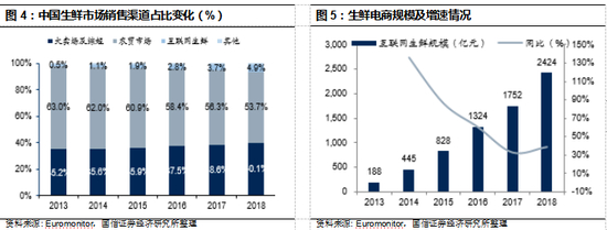 生鲜电商是农贸市场、超市以外的新兴销售渠道,指利用互联网平台展销,将生鲜产品通过自建物流或第三方物流方式配送给终端消费者的交易模式。目前, 中国生鲜零售市场中的电商渠道占比仍相对较低, 但增长速度较快。据Euromonitor 统计数据,2018 年中国生鲜零售市场总额为 4.95 万亿元,同比增