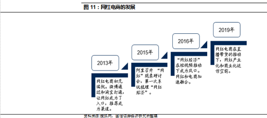 2013 年,当时的重要流量平台微博的商业化进程加速,微博和淘宝正式宣布合作,电商和网红开始融合,“网红电商”初见端倪。微博通过和淘宝打通,让网红成为了入口,推荐成为渠道,网红商业化之路不断扩展。