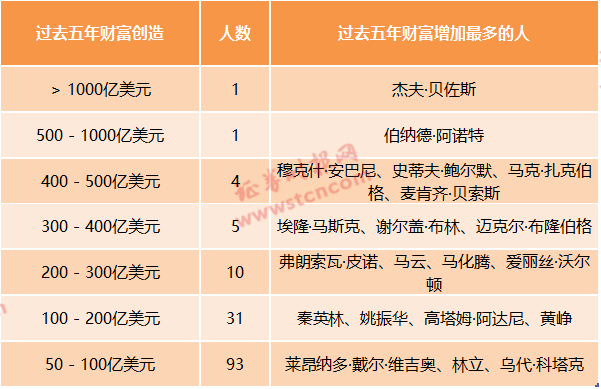 从绝对金额来看,科技行业同样是最大的财富创造领域。在过去5年里,共有145人为自己创造了超过50亿美元的财富,其中以亚马逊创始人杰夫·贝佐斯为首,过去五年创造了1,060亿美元的财富。