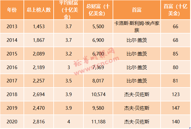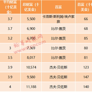 2、富豪的钱也越来越多了:上榜富豪们总财富,今年增长16%,至11万亿美元,比五年前增长66%;