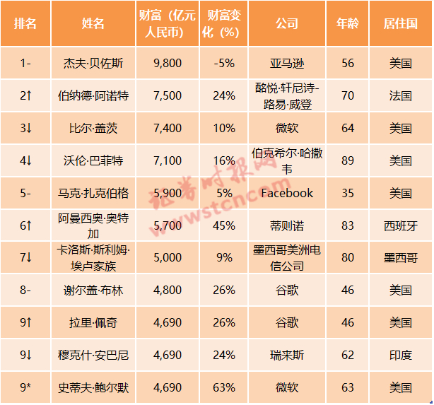 亚马逊56岁的杰夫·贝佐斯以9800亿人民币的财富连续第三年成为全球首富。他的财富比去年下降5%,主要是因为他与前妻麦肯齐达成了“史上最贵”离婚协议。麦肯齐以3080亿人民币的财富独自上榜。