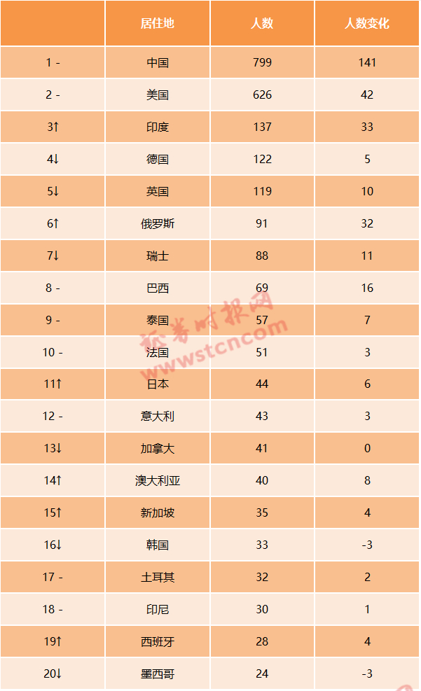 数据显示,中国有799位十亿美金企业家,绝对是世界第一,比排名第二(美国)第三(印度)的两个国家加起来还要多。排名第二的美国有626位。印度上升至第三位,接着是德国和英国,这三个国家都有100多位十亿美金企业家。俄罗斯升至第六位。