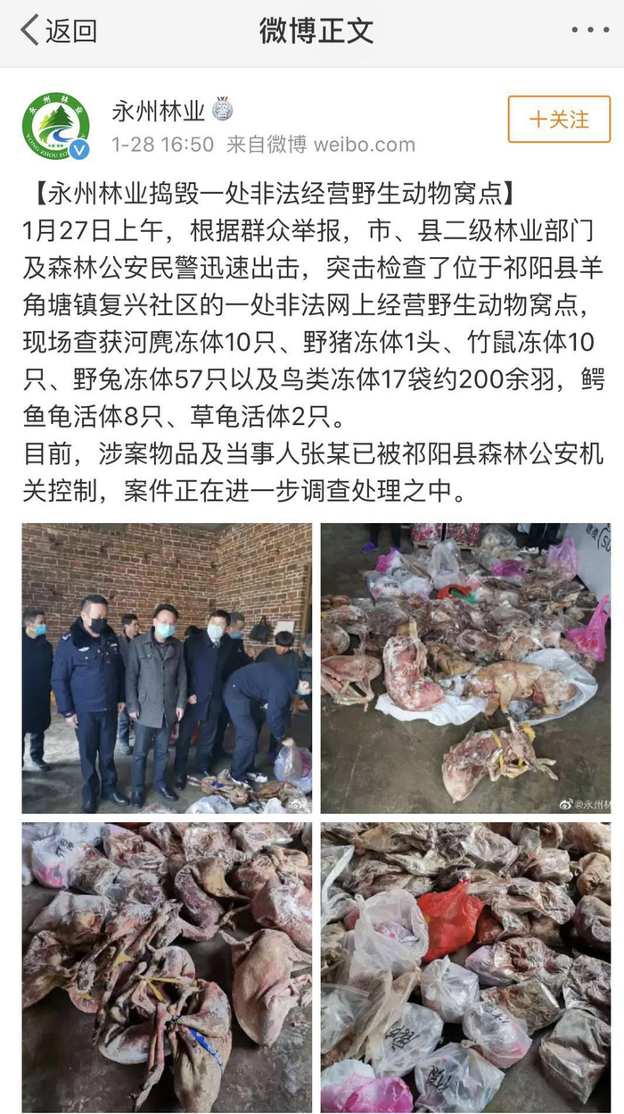 1月28日,湖南职能部门查处了“野味帝国”非法经营窝点,现场查获河麂冻体10只、野猪冻体1头、竹鼠冻体10只、野兔冻体57只以及鸟类冻体200余羽等。