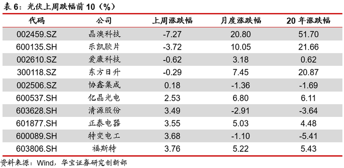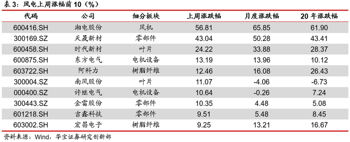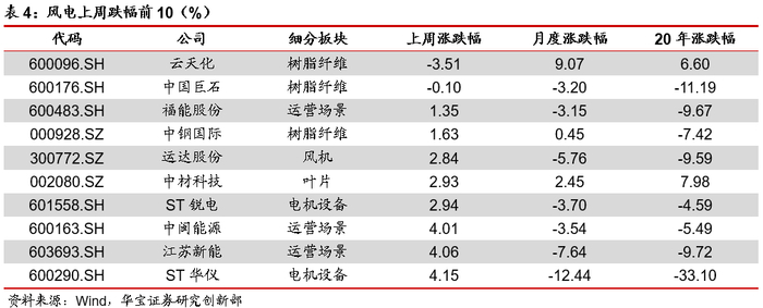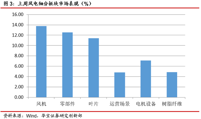 风电方面,树脂纤维板块平均上涨4.87%,叶片板块平均上涨11.42%,零部件板块平均上涨12.55%,电机设备板块平均上涨7.11%,场景运营板块平均上涨4.82%,风机板块平均上涨13.75%。