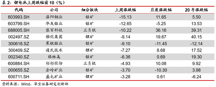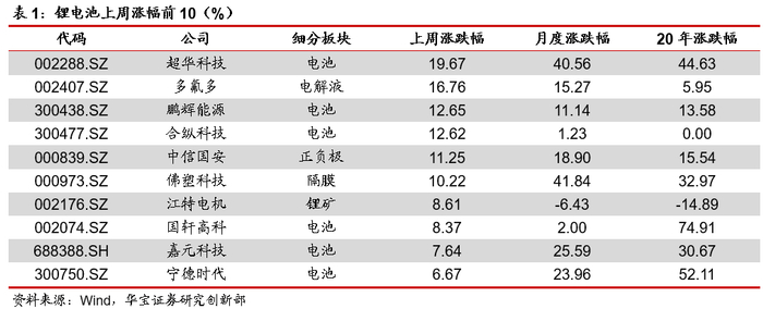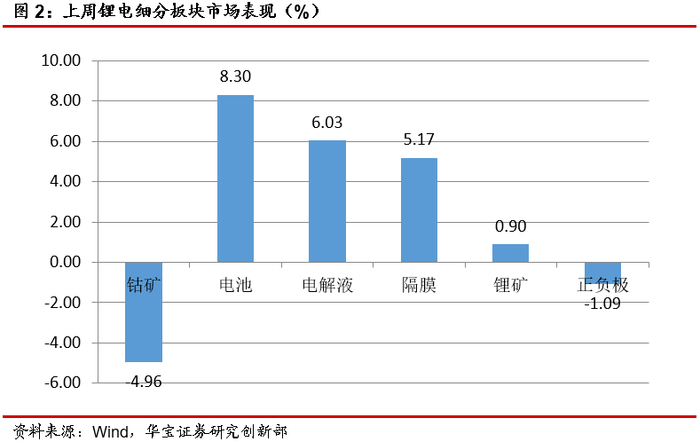 细分板块方面,上周锂资源板块平均上涨0.90%,钴资源板块平均下跌4.96%,正负极板块平均下跌1.09%,电解液板块平均上涨6.03%,隔膜板块平均上涨5.17%,电池板块平均上涨8.30%。