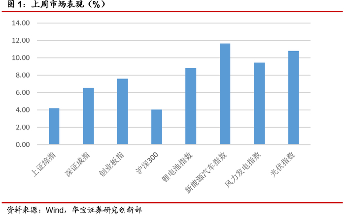 上周(2月17日-2月21日)上证指数上涨4.21%,深证成指上涨6.54%,创业板指上涨7.61%,沪深300上涨4.06%,锂电池指数上涨8.83%,新能源汽车指数下11.66%,风力发电指数上涨9.44%,光伏指数上涨10.56%,整体表现远好于大盘。