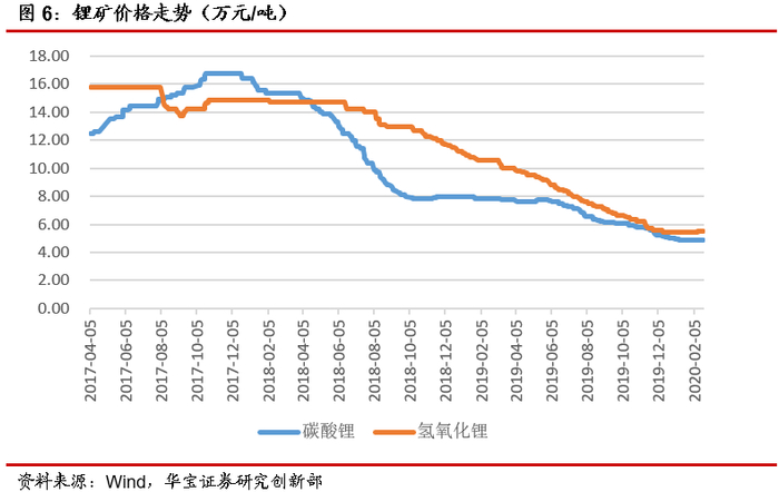 锂盐价格结束横盘出现上涨信号。从锂盐的需求端来看,2020年及以后,宁德时代、松下、LG化学等国内外锂电池巨头仍在不断扩大产能,例如宁德时代主导的四川时代动力电池项目在去年12月开始动工,预计新增产能约30GWh,这无疑对锂盐价格形成一定的支撑。供应方面,前期锂产能释放过快造成的供应过剩问题仍然存在。因此看好今年锂盐价格触底反弹,具体反弹幅度则要视下游电池出货量以及上游供给收缩程度而定。