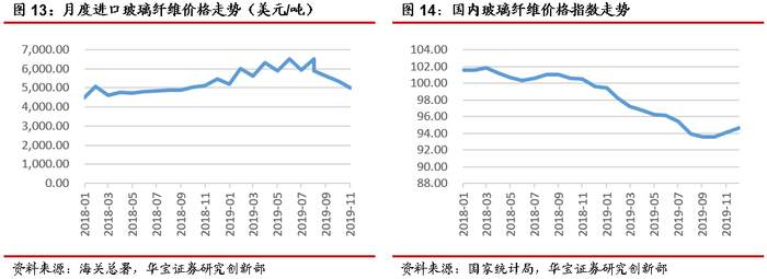从产能上看,2019年玻纤产能扩张步伐明显放缓,产能经过逐步消化,供给压力有所减轻。2020年虽然继续有大规模的产能在四季度投产,但真正产量贡献将在2021年,因此在经历了19年扩张的供给过剩阶段后,后续随着风机市场的持续增加,玻纤价格有望在底部企稳后反弹。