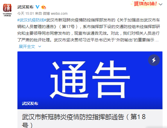 到当天下午3时许,“武汉发布”官方微博再次发布消息,推翻了自己几个小时前发布的“解禁令”。