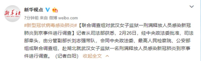 然而,据新华网报道,2月26日,经中央政法委批准,司法部牵头,由分管副部长刘志强带队,会同中央政法委、最高人民检察院、公安部组成联合调查组,赴湖北就武汉女子监狱一名刑满释放人员感染新冠肺炎到京事件进行调查。