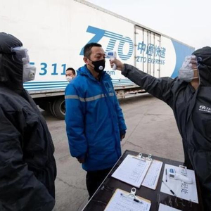 2月20日,山西省太原市,在中通快递山西转运中心,员工进入园区前接受体温检测。中新社记者 韦亮 摄