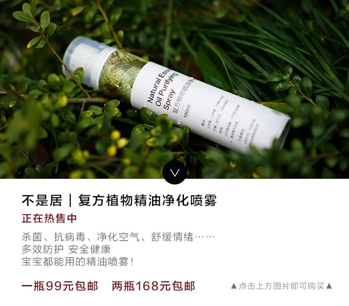 「复方植物精油净化喷雾」使用了低浓度酒精并科学配比抗菌、抗感染类的精油,成分更温和,味道舒适缓和;在达到消毒抗菌的基础上又能让老人、婴幼儿均可安全放心使用。