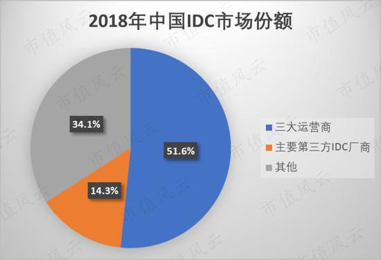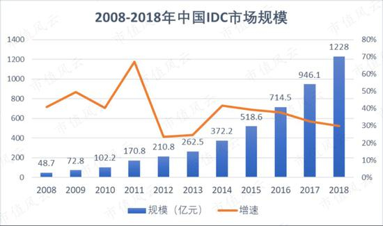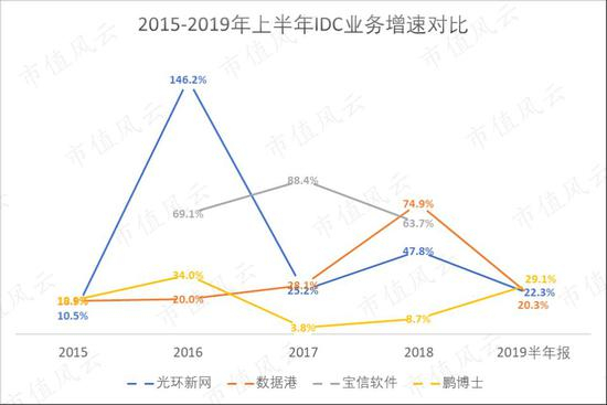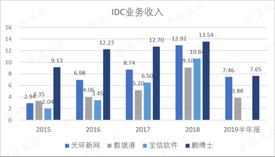 上文提到,2018年我国IDC市场规模较上年增长近30%,以此为标准,除鹏博士以外的三家公司IDC业务的增速均超过市场增速。