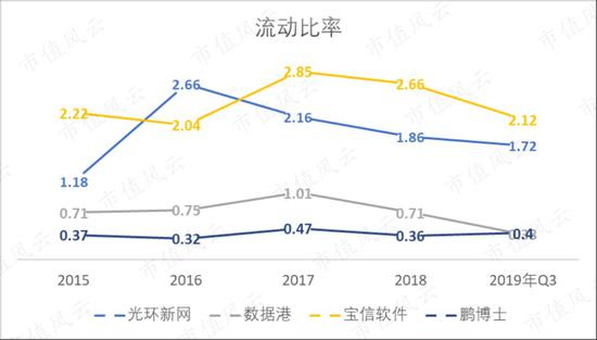 从数值对比情况看,鹏博士的流动比率最低,自2015年以来未曾超过0.5,也没有明显提升,偿债能力不佳。