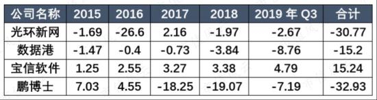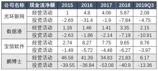 光环新网、数据港和鹏博士近5个报告期的广义经营性现金流净额大部分为负。自2015年至2019年三季度,光环新网合计净流出30.77亿、数据港净流出15.2亿、鹏博士净流出32.93亿。