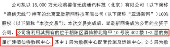 2016年3月,以1.6亿元收购亚逊新网100%股权,利用其位于朝阳区房屋扩建酒仙桥数据中心。