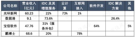 光环新网的IDC业务是服务于其云计算而发展起来的,宝信软件和鹏博士的主营业务分别是软件开发和互联网接入。