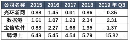 光环新网、数据港和宝信软件的净利率从近年来有所集中。而综合毛利率最高的鹏博士,净利率则自2018年起呈断崖式下跌。