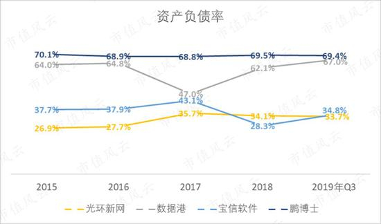 四家公司中,鹏博士的资产负债率最高,常年稳定地处于68%以上。