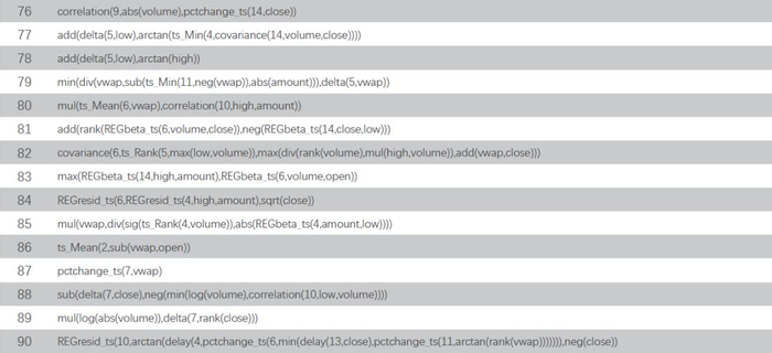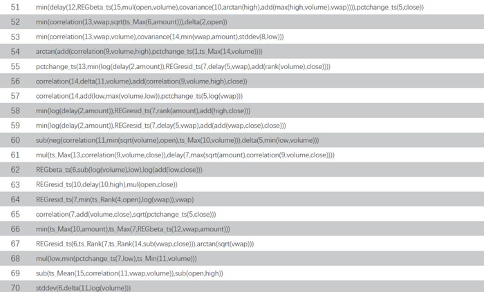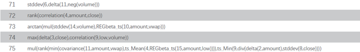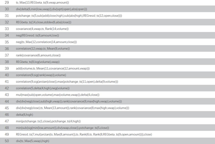 本文所挖掘的100个基于30分时K线的高频因子表达式如下表所示,其中open、high、low、close、和vwap分别为股票K线的开高低收和均价,volume、amount为成交数量和金额,算子定义如前文。