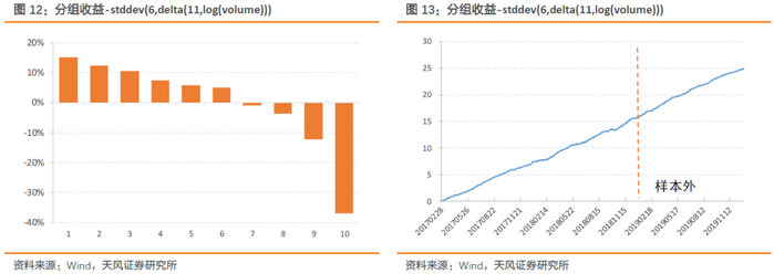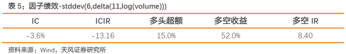 stddev(6,delta(11,log(volume)))指标刻画了成交量变化的波动率,因子从2017年以来IC均值为-3.6%,ICIR为13.16,多头超额收益15.0%,多空IR为8.40。