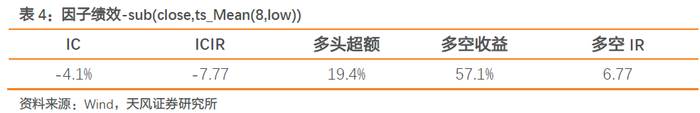 sub(close,ts_Mean(8,low))是个反转指标,其刻画了日收盘价与最近8根30分钟K线最低价均值间的价差。因子从2017年以来IC均值为-4.9%,ICIR为10.98,多头超额收益15.6%,多空IR为6.74,信号表现出稳健的选股能力。