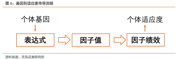 我们将因子表达式作为个体基因,通过因子表达式可计算具体因子值。因子挖掘的目标是寻找具有显著alpha的选股因子,因此我们通过因子的选股绩效度量个体适应度,进而让因子种群朝着“alpha”的方向进化。
