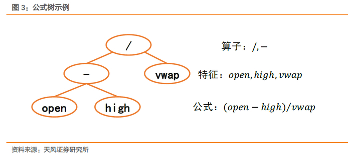 对于遗传编程而言,个体基因的表示是其核心之一。我们将选股因子看作遗传编程算法中的种群个体,那么因子的具体表达式即为个体独有的基因。例如,结合股票日行情数据以及四则表达式我们可构造指标“(open-high)/vwap”,以树形结构可将其简洁地表示如下。