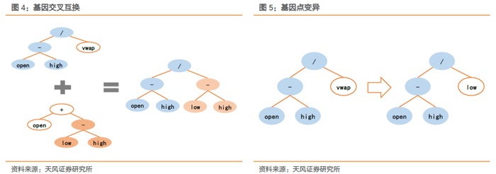 通过树结构,因子基因的交叉与变异也能清晰地展现。在进化中种群中往往存在不同个体间基因的交叉互换以生成新的个体,其原理如下左图所示,树1将子树“vwap”与树2的子树“low-high”交叉互换得到新的树结构“(open-high)/(low-high)”。