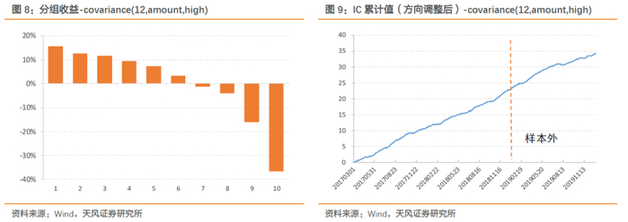 covariance(12,amount,high)指标的分组收益以及IC累计值如下图所示,因子单调性良好,IC在样本外仍然保持稳健增长。