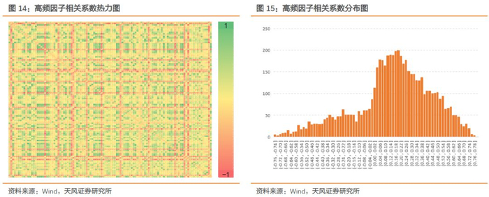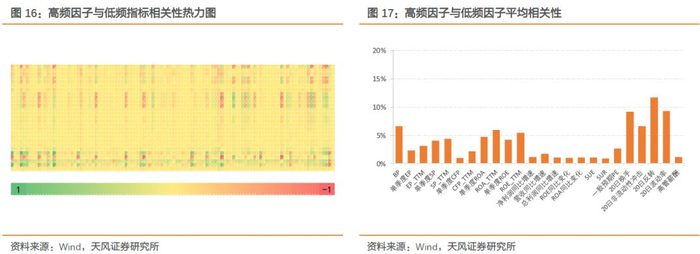 此外,我们对比本中的高频因子与常见低频选股因子间的相关系数,如下图所示。左图中横轴是高频因子,纵轴是低频因子,可以看出二者间相关性基本在0附近波动。高、低频因子之间相关系数绝对值均值如右图所示,各低频因子与高频因子的平均相关性均在20%以下。